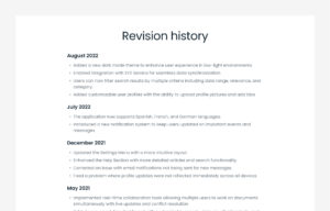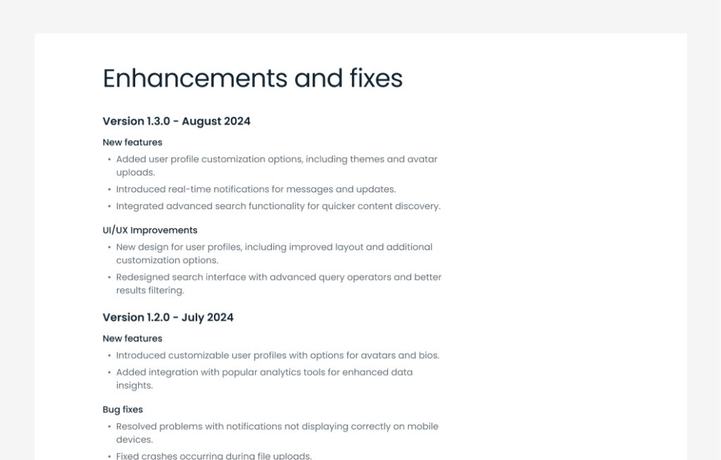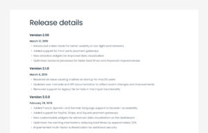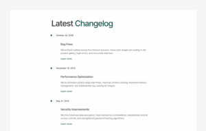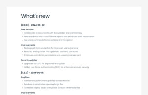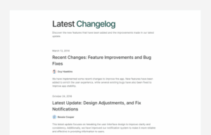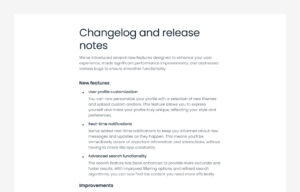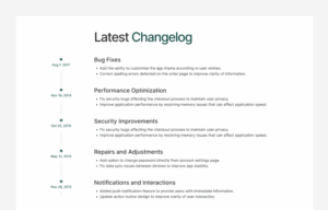 changelog section shows a list of updates, improvements, and bug fixes made to a product or website.