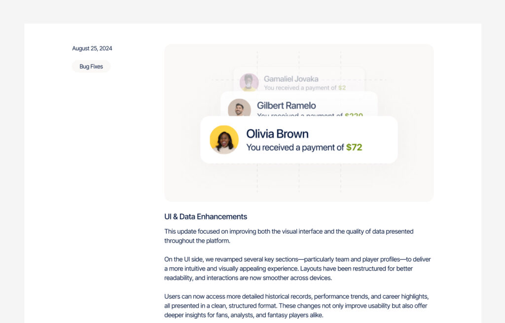 changelog section shows a list of updates, improvements, and bug fixes made to a product or website.