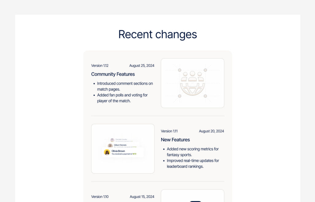 changelog section shows a list of updates, improvements, and bug fixes made to a product or website.