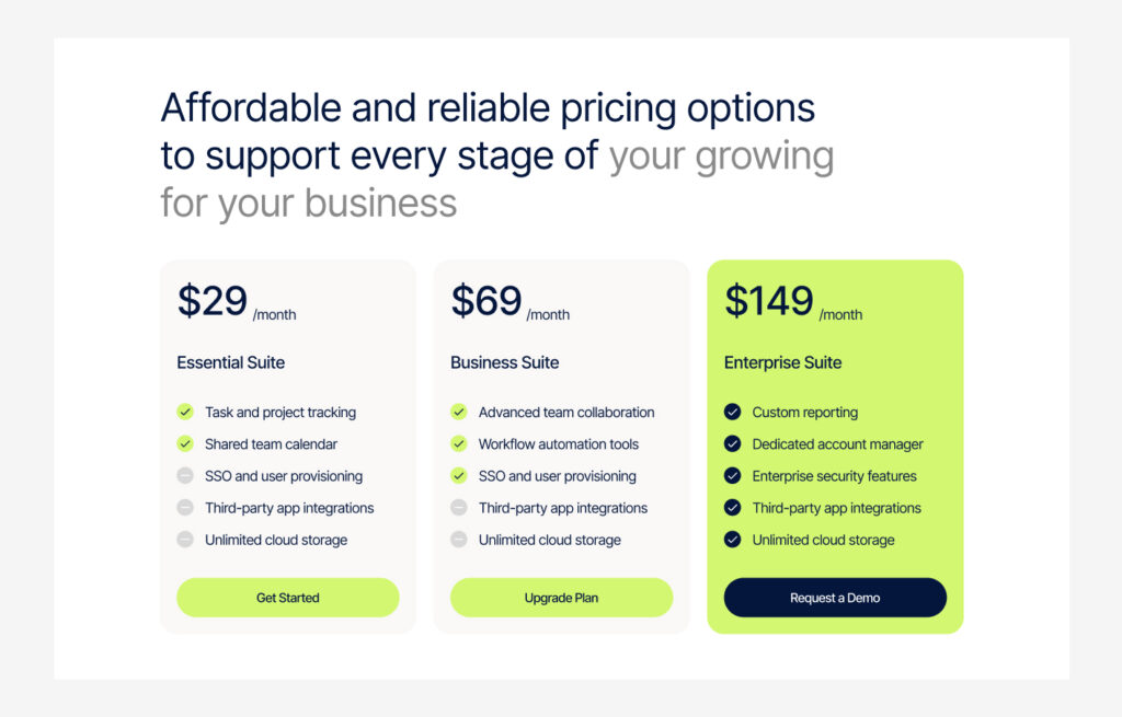 A pricing section shows the cost and features of different plans or services.