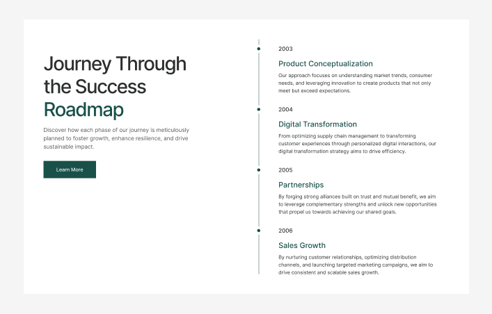 A roadmap section shows the planned and completed milestones for a product or project.